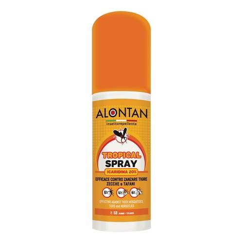 Alontan TROPICALDescrizione Insetto repellente efficace contro zanzare tigre e zecche. Avvertenze Tenere fuori dalla portata dei bambini al di sotto dei 3 anni di età. Conservazione Conservare in luogo fresco ed asciutto. Validità a confezionamento integro: 48 mesi. Formato Bomboletta spray da 75 ml. Cod. 702.12